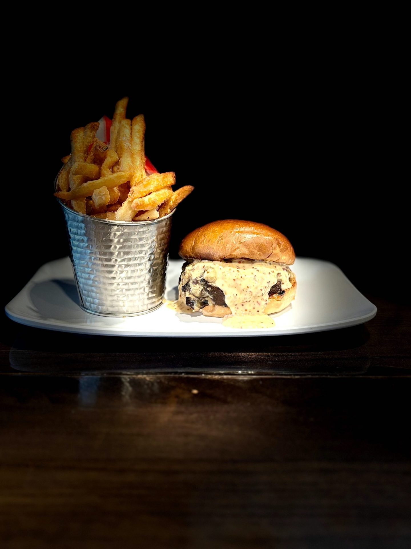 Angus Beef Patty, Cremini and Button Mushrooms, Caramelized Onions, Pickled Jalapenos, Arugula, Swiss and Pepperjack Cheeses, Whole Grain Dijonaise. Served on a Potato Bun