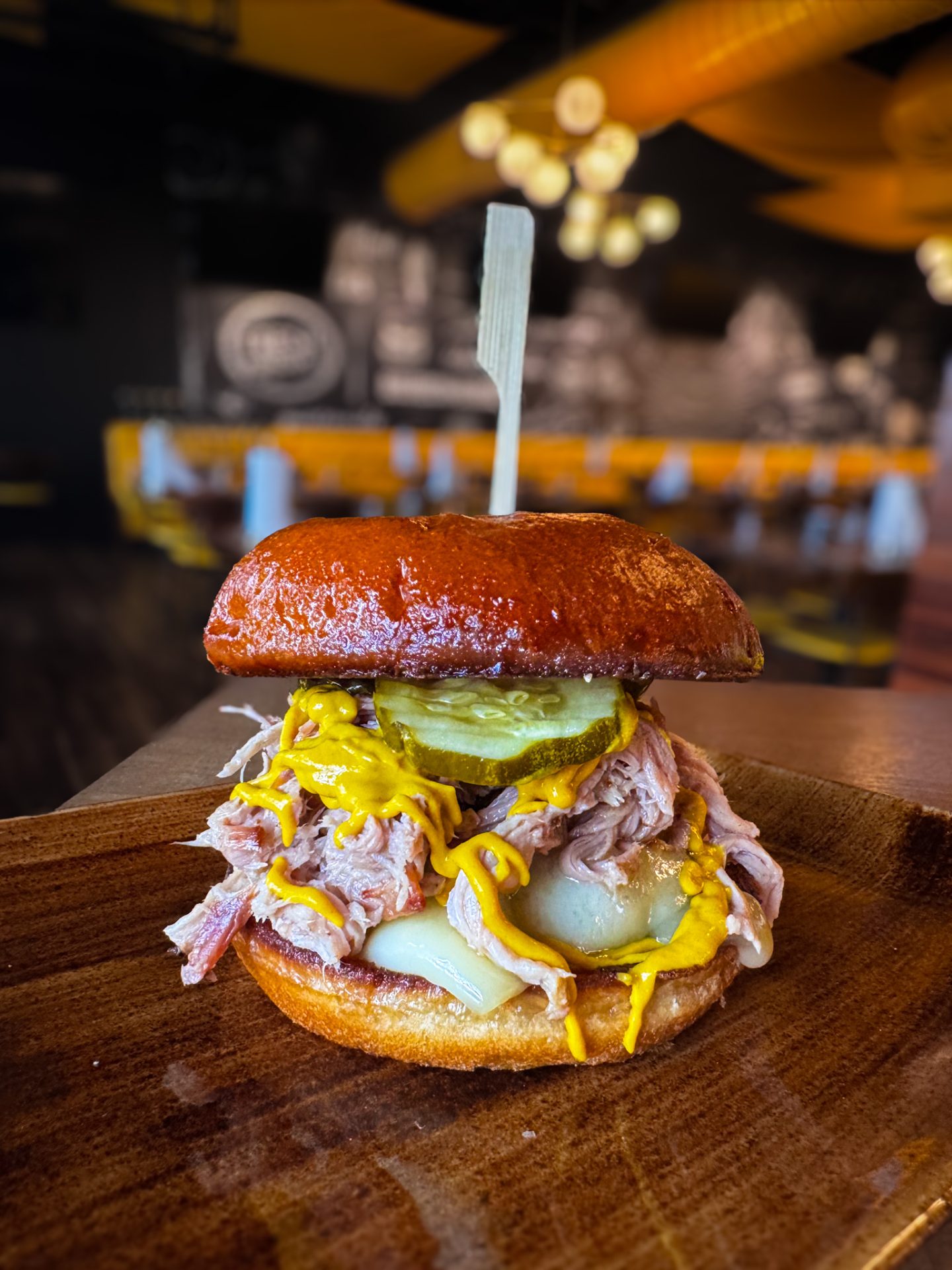 House Ground Certified Angus Beef Patty with Swiss Cheese, Mustard, Pickles, Lechon Asado, Smoked Hickory Ham, on Toasted Challah Bread