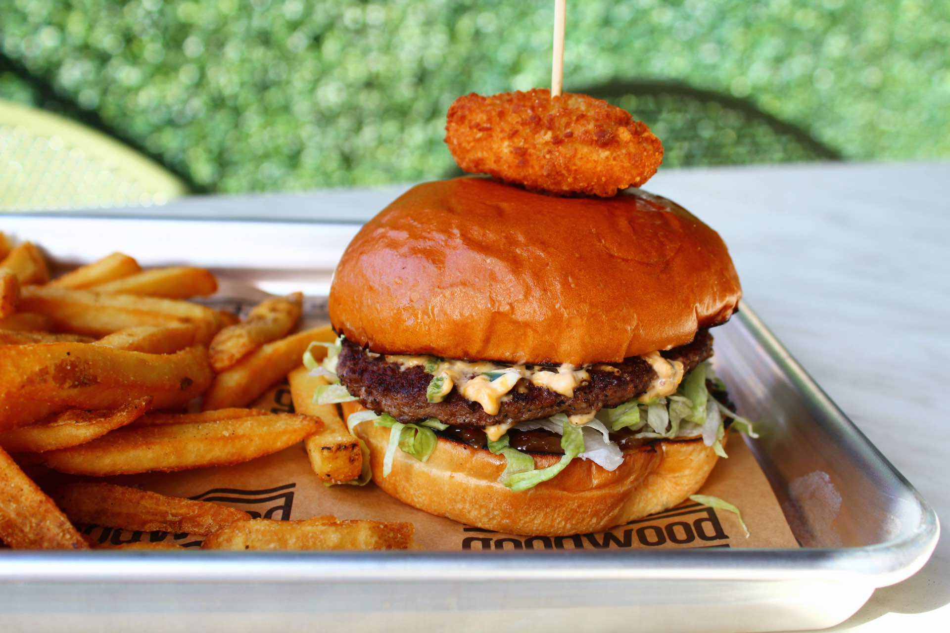 Kickin' Pimento 4oz. burger featuring pimento cheese, lettuce, bacon jam, and pickles on a brioche bun - topped with a jalapeño popper. (Black Bean veggie option)