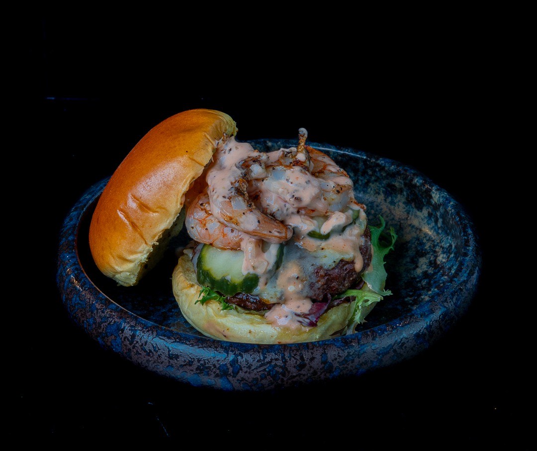 Beef Patty | Shrimp | Cheddar Cheese | House Pickles | Zesty Aioli